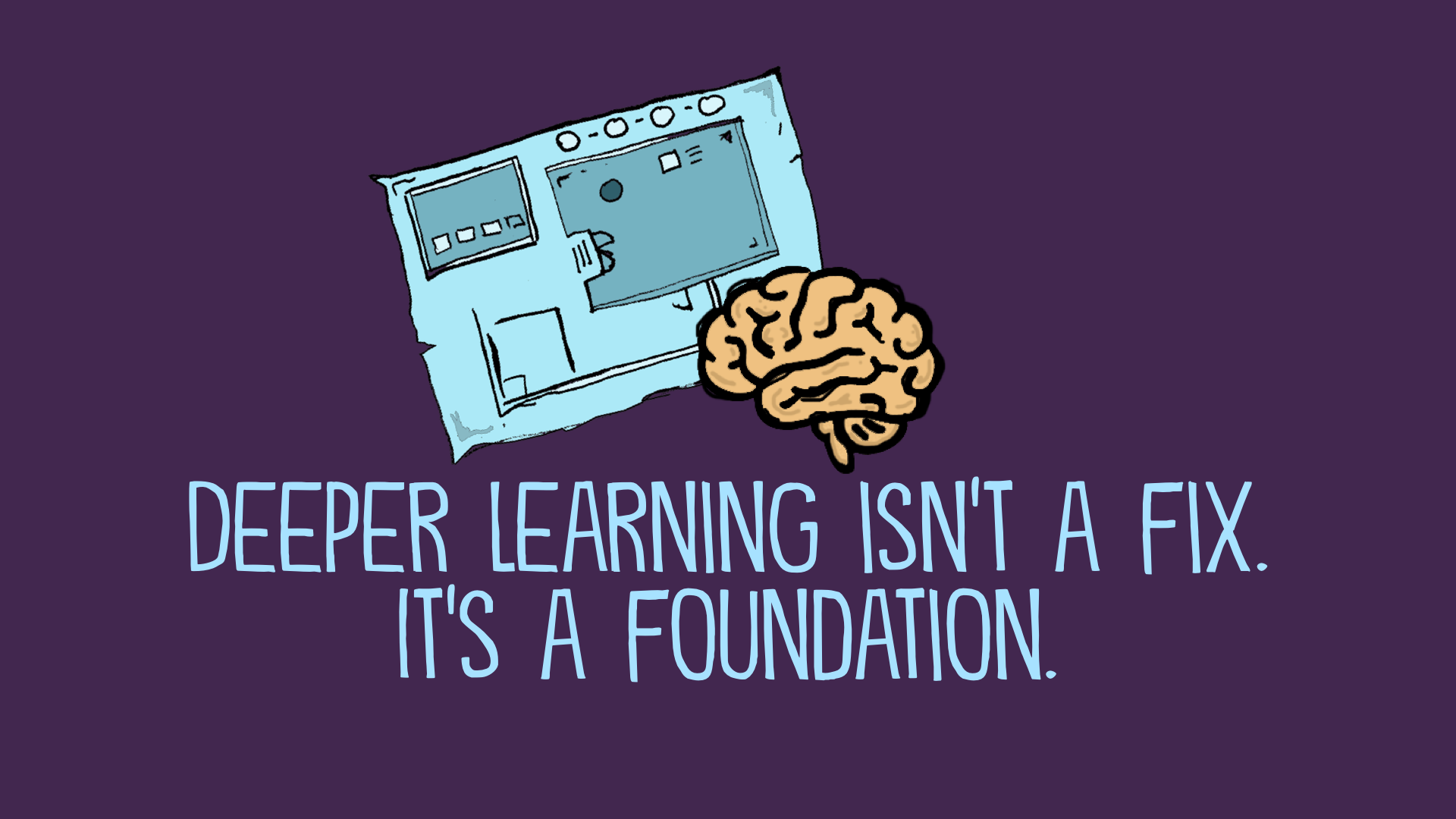 Illustration of a blueprint and a brain on a purple background with the caption “Deeper learning isn’t a fix. It’s a foundation.” The image visually connects planning and thinking as core elements of lasting learning.