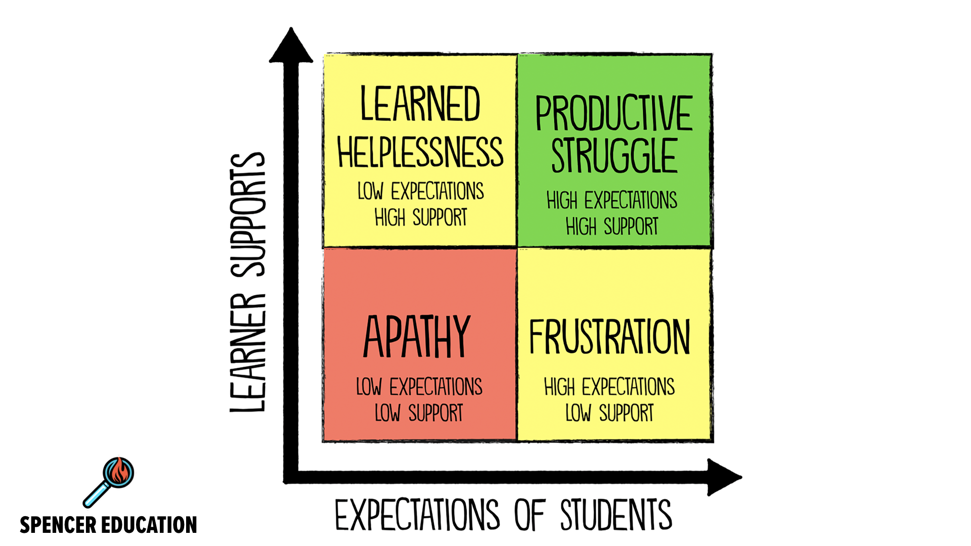 A four-quadrant chart illustrating the relationship between learner supports and expectations of students. The vertical axis represents learner supports, increasing upward, and the horizontal axis represents expectations of students, increasing to the right. The top-right quadrant is green and labeled “Productive Struggle” with “High expectations, high support.” The top-left quadrant is yellow and labeled “Learned Helplessness” with “Low expectations, high support.” The bottom-right quadrant is yellow and labeled “Frustration” with “High expectations, low support.” The bottom-left quadrant is red and labeled “Apathy” with “Low expectations, low support.” The image is credited to Spencer Education and visually represents how balancing high expectations with high support leads to productive struggle.